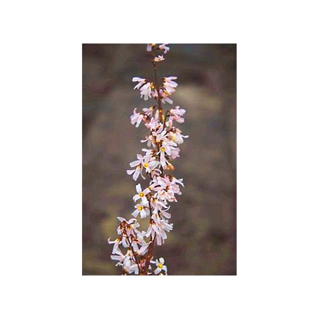 (White Forsythia) An unusual shrub with long arching branches and clusters of pale pink-tinged flowers covering the bare stems in Spring before the young leaves emerge. leaves are bright green in colour with yellow and bronze tints before they fall in autumn.