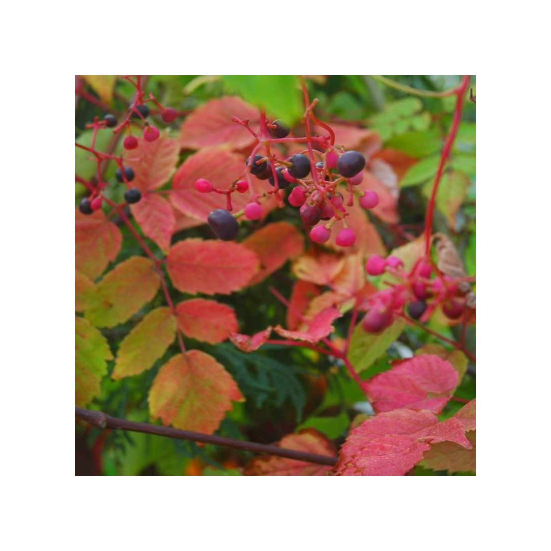 An eye-catching climber native to China, Ampelopsis megalophylla has huge green leaves (up to 50-60 cm long) when mature which turn bright red, pink and orange in autumn before falling. The profusion of small, green flowers in summer are followed by rose pink berries that ripen to black contrasting well with the pretty autumn colour.