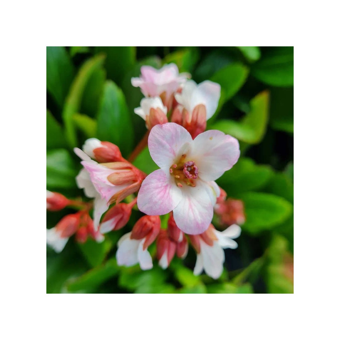 Bergenia 'Fire and Ice' is a compact clump forming, evergreen perennial with tall stems topped with handsome bell-shaped white flowers with dark pink/red calyces in Spring. The leaves are large, rounded and dark green in colour.