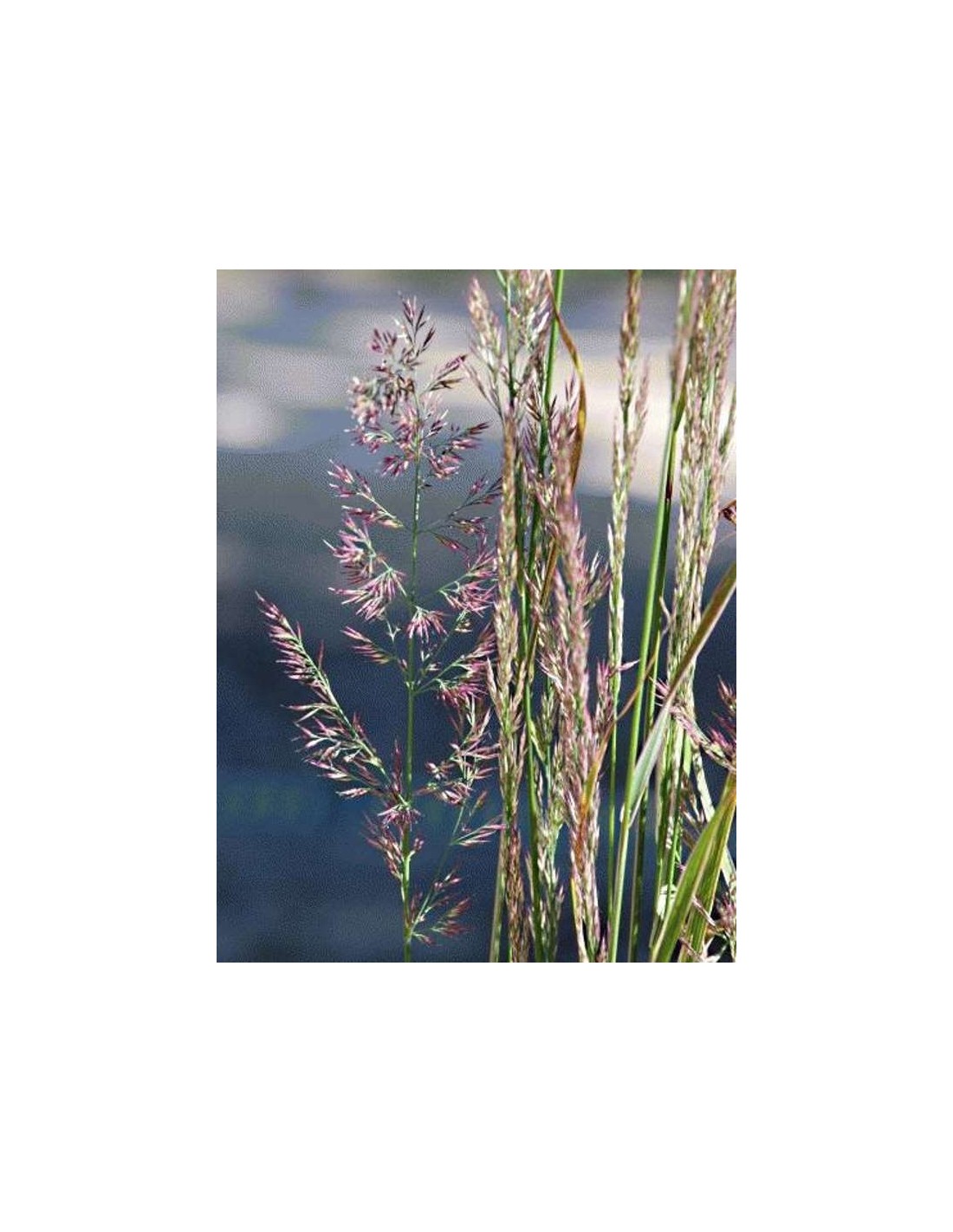 An elegant grass, Calamagrostis x acutiflora 'Overdam' has flat, arching leaves with a variegated yellow margin that fades to pink tinged white as it ages. Handsome pinkish-grey flower heads appear from midsummer and contrast well against the colourful foliage.