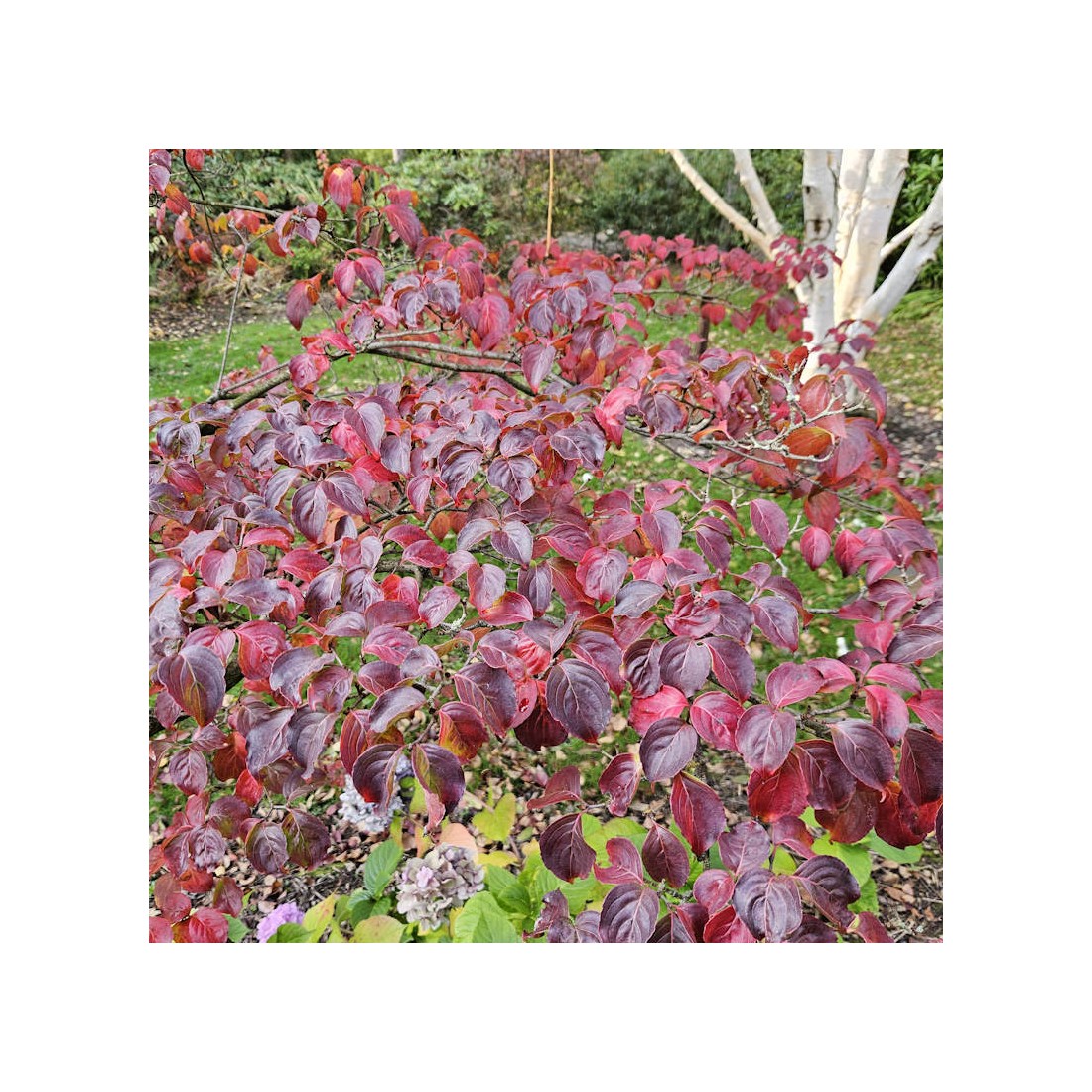 (Flowering Dogwood) A stunning large shrub or eventually very small tree with masses of creamy-white flower bracts in early summer which quickly turn light pink as they age. The summer leaves are dark green in colour, turning vivid shades of dark purple-red in autumn before falling.