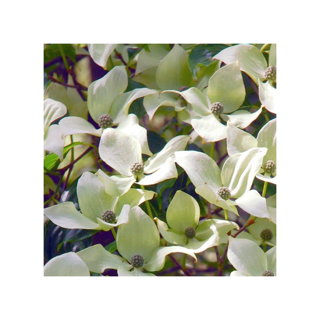 (Flowering Dogwood) New to us, this grows to be a very slender, upright large shrub or eventually very small tree smothered with large, creamy-white flower bracts in early summer once established. The dark green summer leaves turn shades of purple and orange before falling.