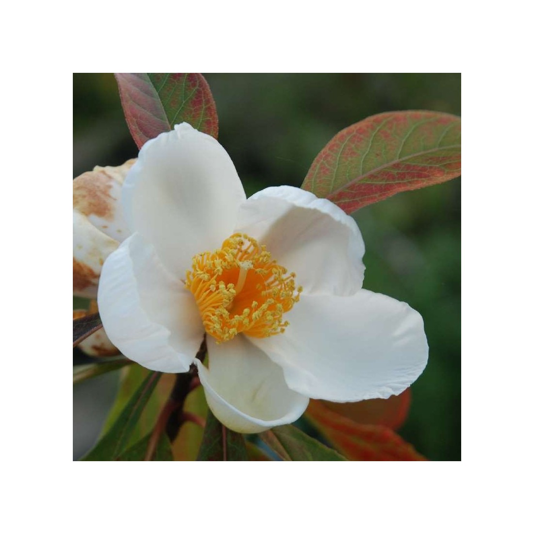 This has spectacular camellia-like, sweetly fragrant, large white flowers (to 6 cm in diameter) with centers of bushy, bright yellow stamens from late summer to early autumn. The leaves are long, narrow and dark green, turning excellent shades of orange, red and purple in autumn before falling.