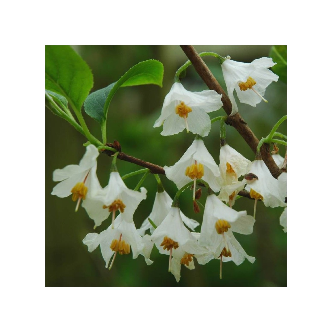 (Snowdrop Tree) A beautiful often multi-stemmed tree native to the United States, Halesia carolina has clusters of three to five, pendulous, white flowers with a golden center and delicate scent in late spring. The flowers usually appear on fairly young plants and are borne on branches of one year old wood. The leaves are dark green turning golden yellow in a good, crisp autumn before falling.