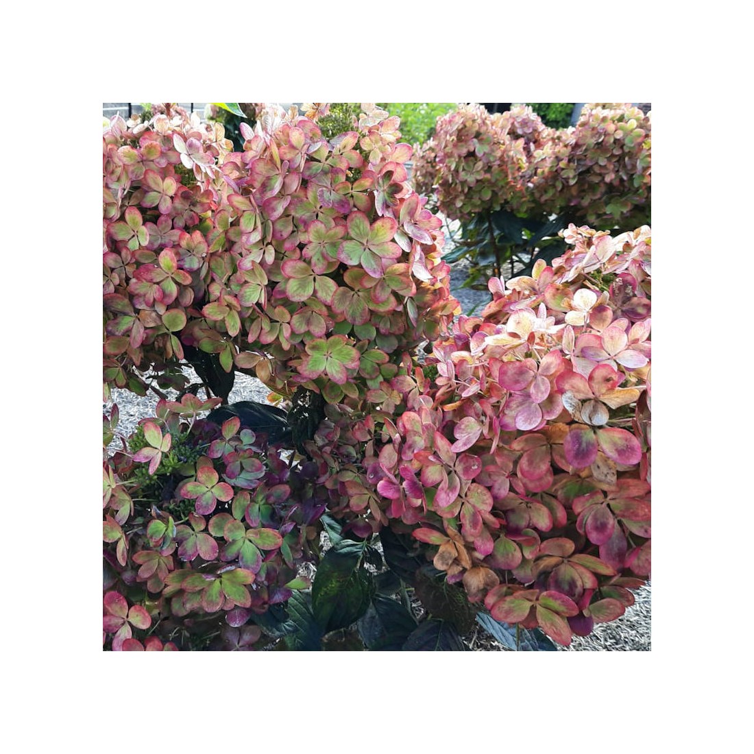 Photo shows the creamy-white young flowers in early to mid summer and the pink and green flower colour which develops in late summer/early autumn.
