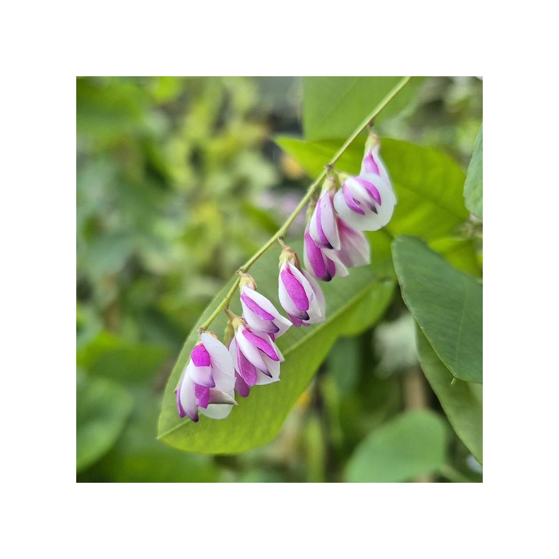 A stunning autumn flowered semi-herbaceous shrub with dainty, light green leaves and arching branches supporting sprays of pinkish-purple and white, pea-like flowers flowers.