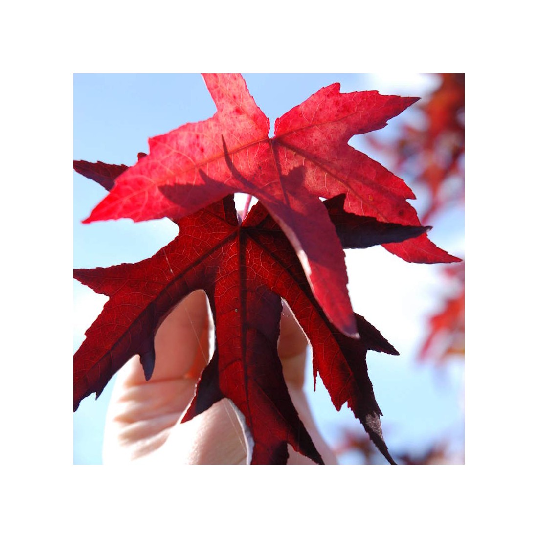 (Sweet Gum) Liquidambar styraciflua 'Stella' has deeply cut, star shaped, green leaves which turn dramatic shades of purple and rich red for several weeks before falling in autumn. The colourful cut leaves in autumn give this form a distinctly different feel to other Liquidambars.