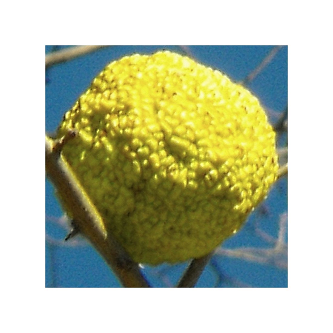 (Osage orange) An unusual small tree in the UK, Maclura pomifera has thorny branches and once established, large & pale yellow, orange-like fruit (male and female plants required).