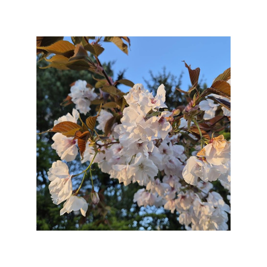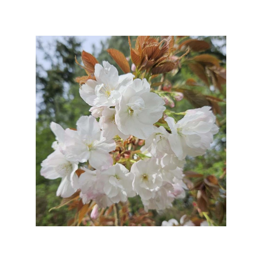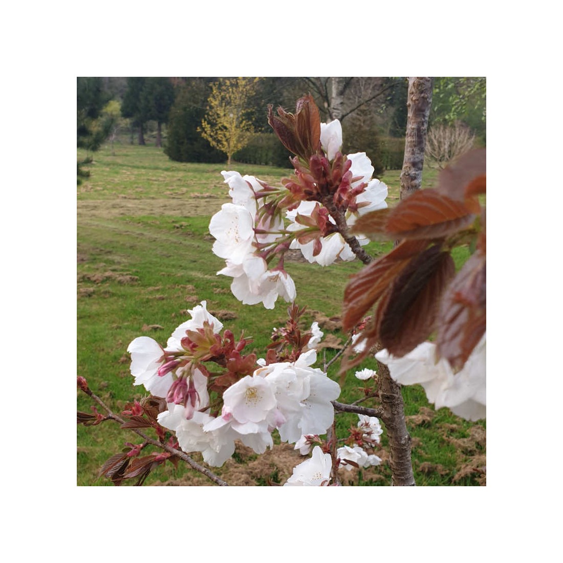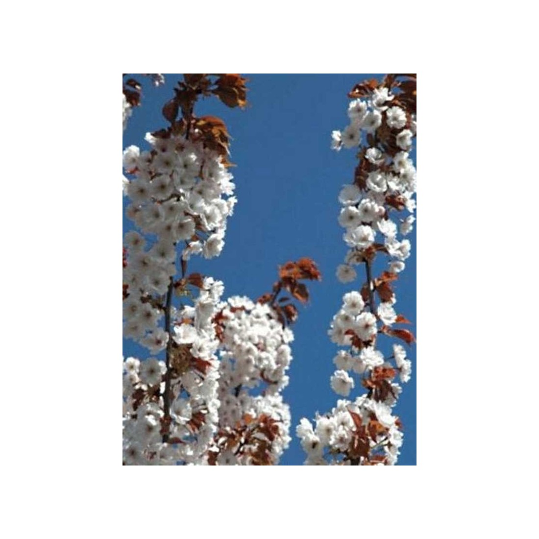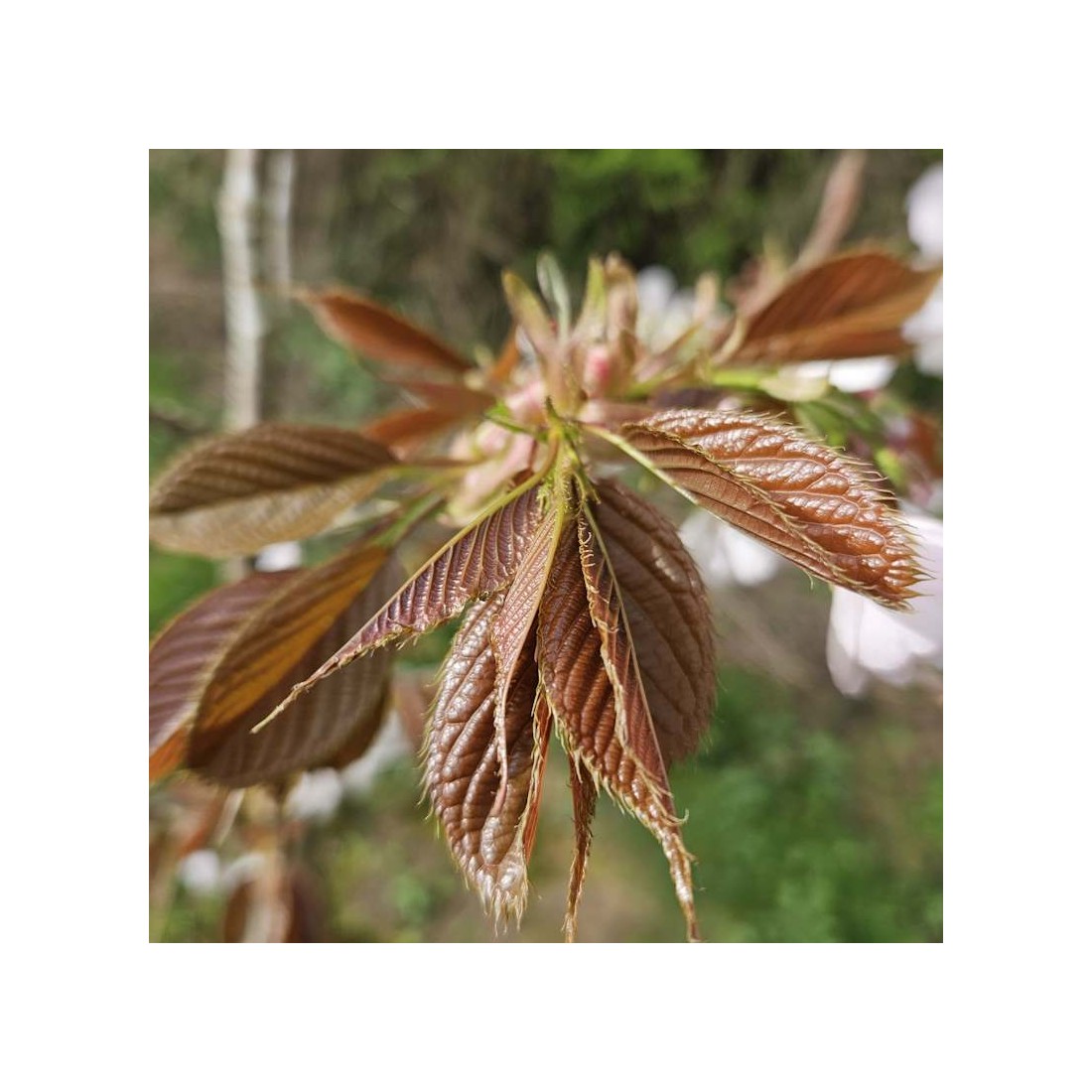 (Flowering Cherry) Also known as Prunus 'Chocolate Ice', this is an eye-catching, small, upright tree with clusters of large single, white flowers and lovely deep chocolate-brown young leaves in spring. As the leaves age in summer they gradually turn dark green.
