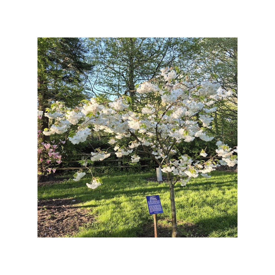 (Flowering Cherry) Prunus 'Shogetsu' is a very handsome small tree once established with elegant branches covered with pink buds in spring opening to semi-double white or very pale pink flowers on long stalks. The green summer leaves have red, orange & gold autumn tints before falling.
