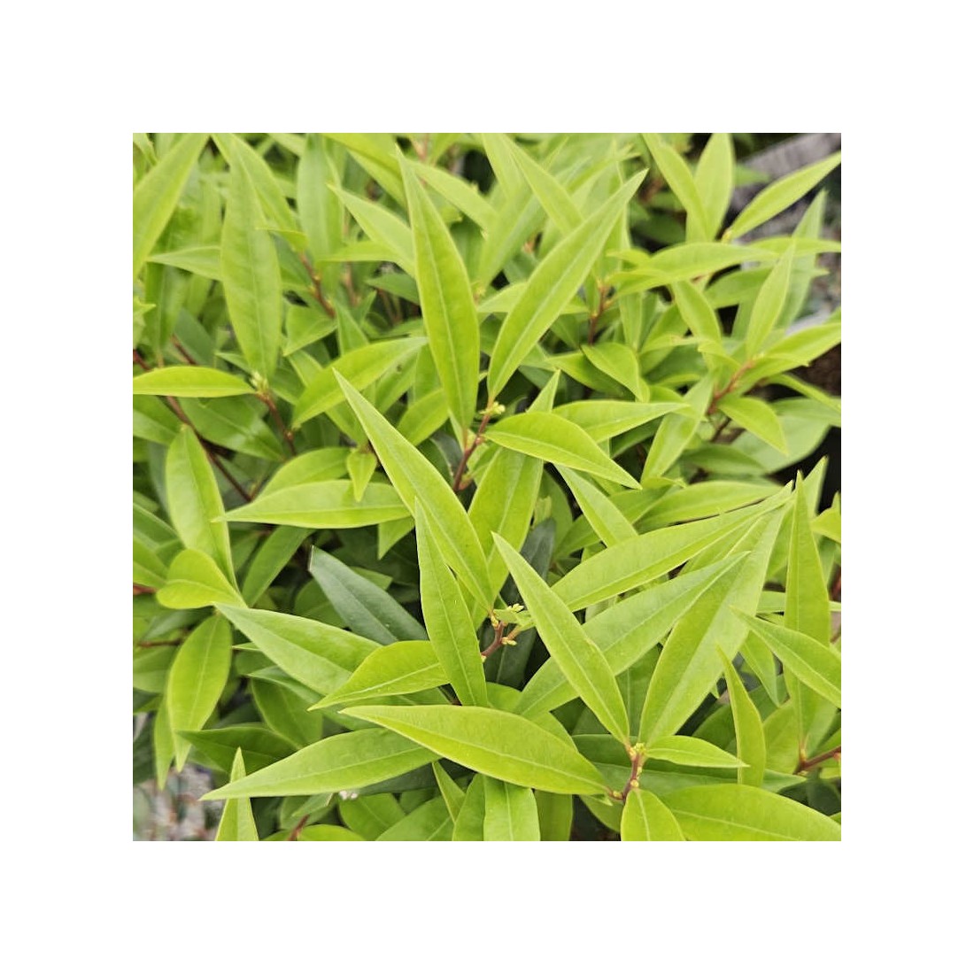 (Sweet Box) A popular and attractive, low growing evergreen shrub with slender, glossy dark green leaves and clusters of highly scented white flowers from December to March. The stems are dark purple-red in colour.