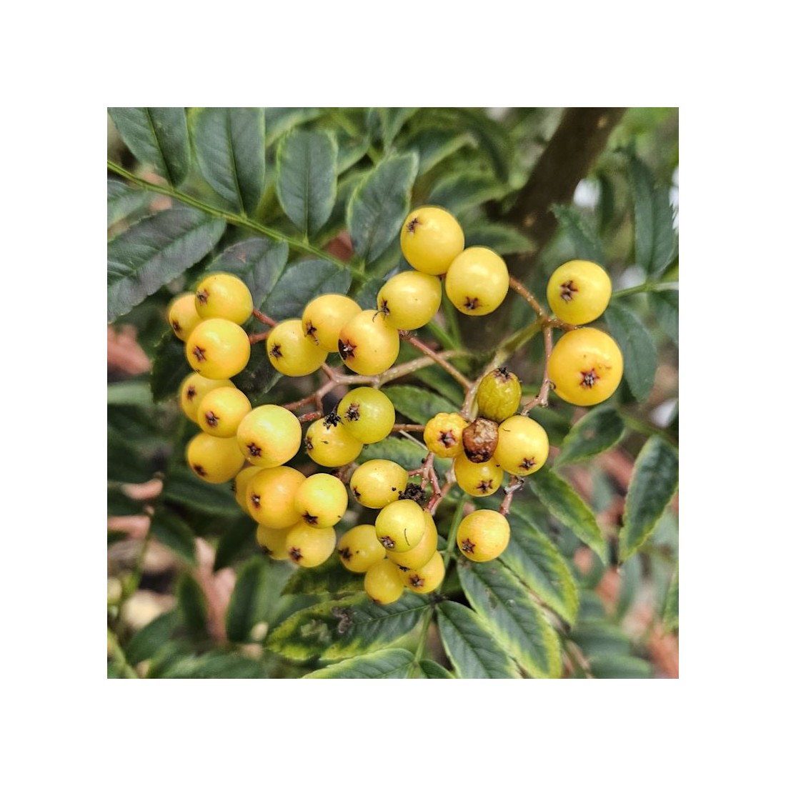 Clusters of white flowers in early summer are followed by vivid yellow fruit which compliment the autumn colour.