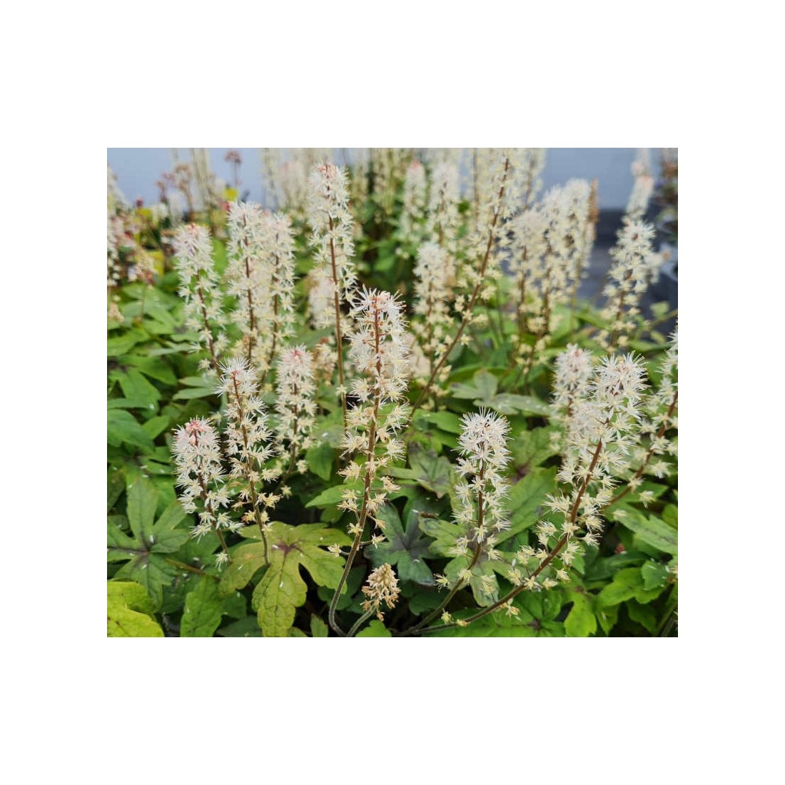 (Foamflower) Tiarella 'Spring Symphony' is a spreading semi-evergreen perennial with masses of upright stems in late Spring or early Summer topped with pale pink buds & dainty pale cream flowers.