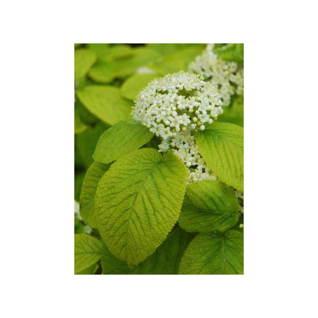 (Golden Wayfaring Tree) A delightful but often overlooked, medium sized garden shrub which has glorious, soft-golden leaves in late spring and pretty heads of fragrant creamy-white flowers in late spring. These flowers can be followed by vivid pinkish-red fruit on an established plant.