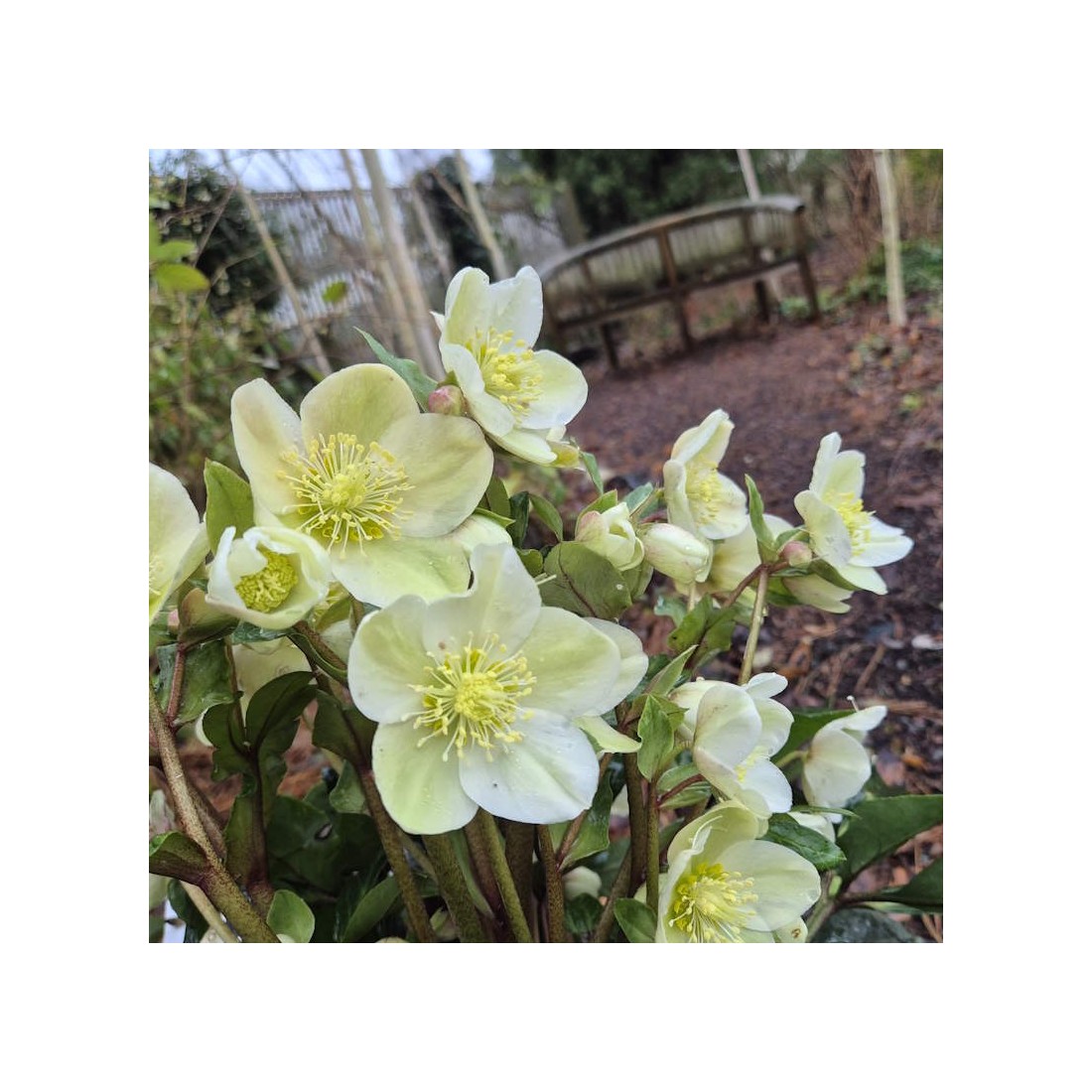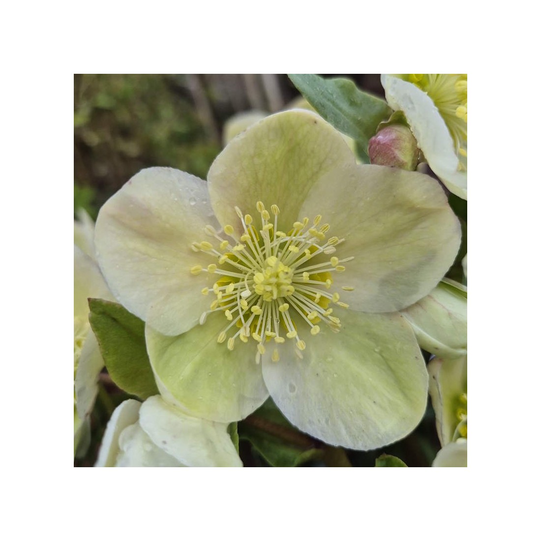 A new evergreen hellebore with glossy dark green leaves large lime green to white flowers appearing in late winter and early spring.
